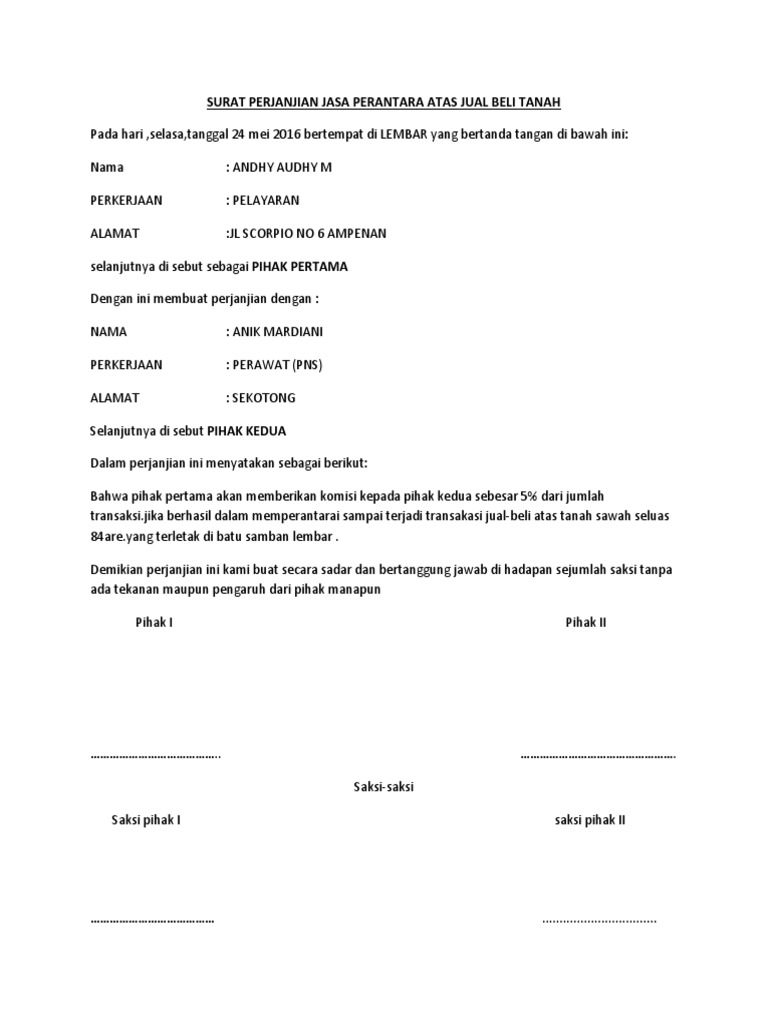 Sebidang tanah a di jual dengan luas 500m2, total harga 5.000.000.000. Bila ingin mendownload contoh surat perjanjian jual beli rumah dalam format.doc silahkan langsung klik link dibawah ini itu tadi penjelasan singkat tentang contoh surat perjanjian jual beli rumah yang dapat kami berikan. Selaku yang memberikan pernyataan komitmen fee disebut sebagai pihak pertama. Telah saya bagikan sebuah postingan contoh surat perjanjian sewa rumah yang. Untuk itu, dalam menjadi perantara atas jual beli tanah, rumah dan sebagainya, perjanjian yang kita buat dengan pihak yang memakai jasa kita, hendaknya dilakukan secara tertulis.